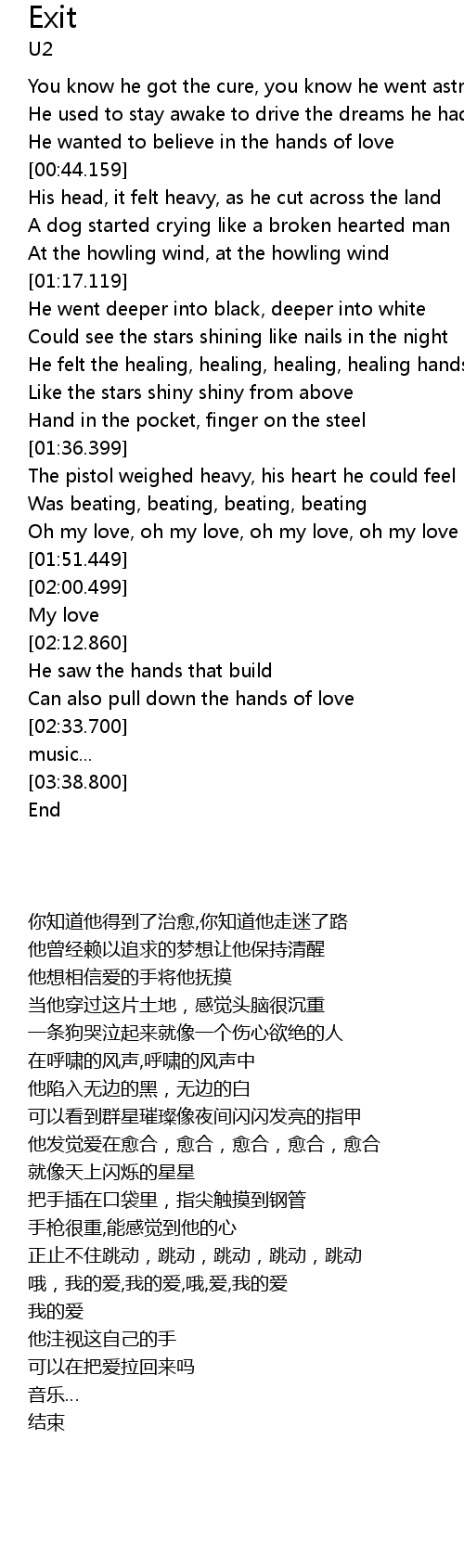 | [01:27.429] | He felt the healing, healing, healing, healing hands of love |