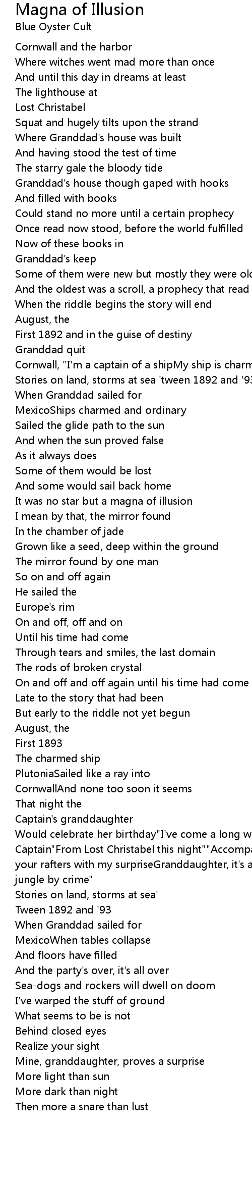 Captain"From Lost Christabel this night""Accompanied by my dog familiarTo blast your rafters with my surpriseGranddaughter, it's a foreign mirrorTaken from the jungle by crime" |