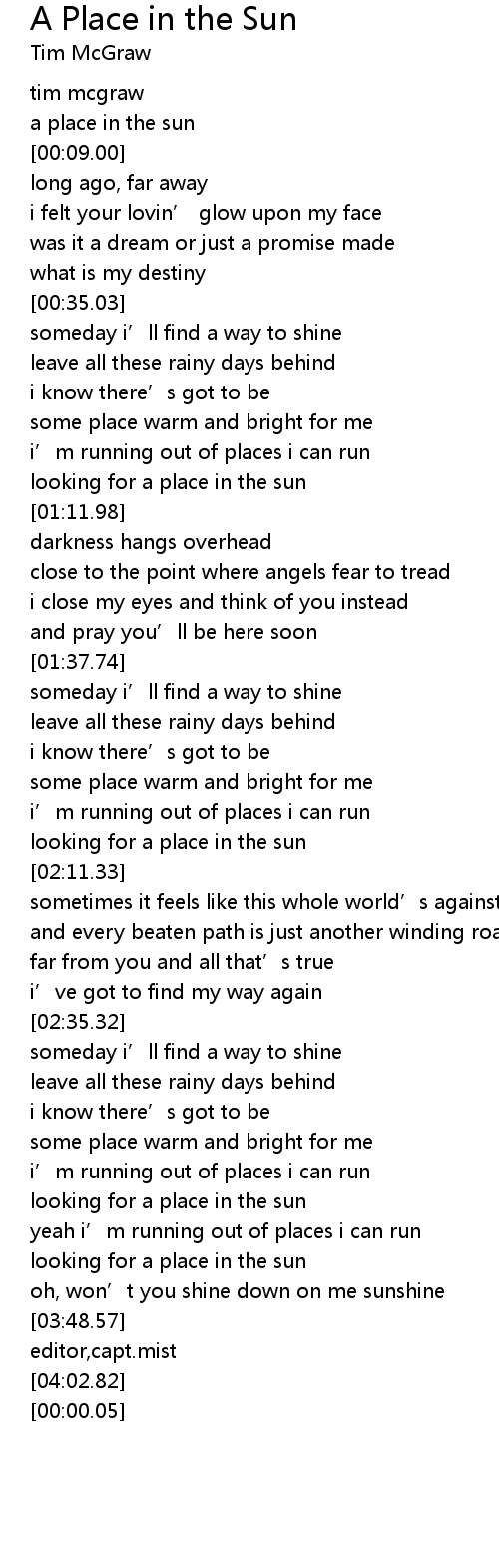 | [03:35.71] | oh, won' t you shine down on me sunshine |