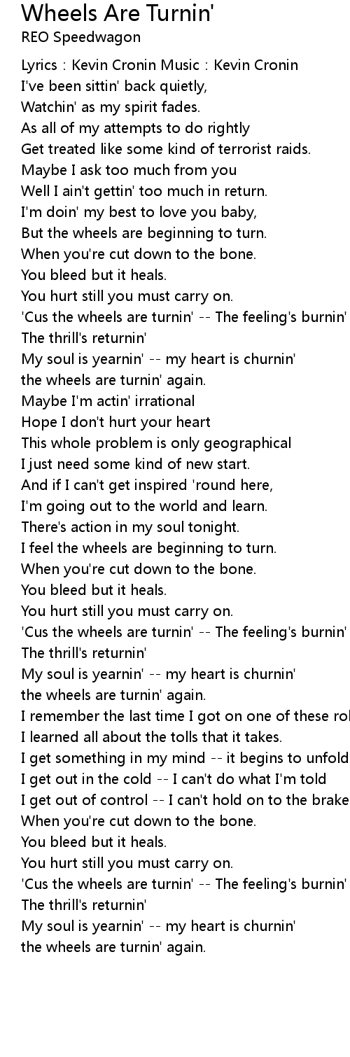 | ' Cus the wheels are turnin' The feeling' s burnin' | |