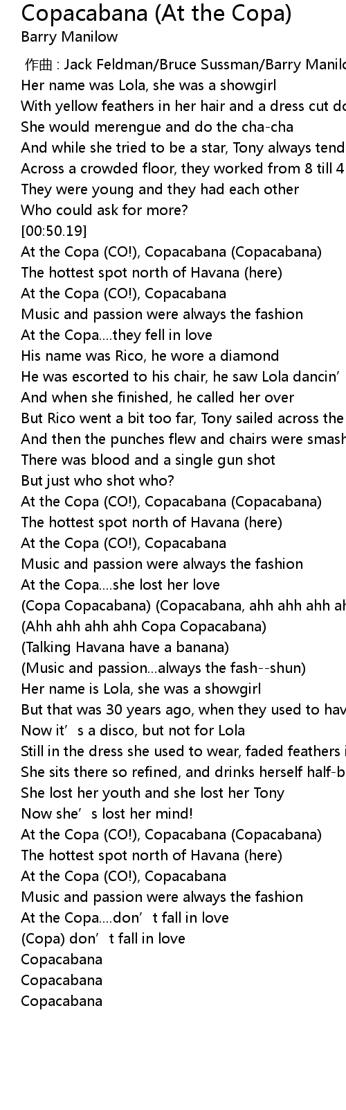 | [00:50.78] | At the Copa (CO!), Copacabana (Copacabana) |