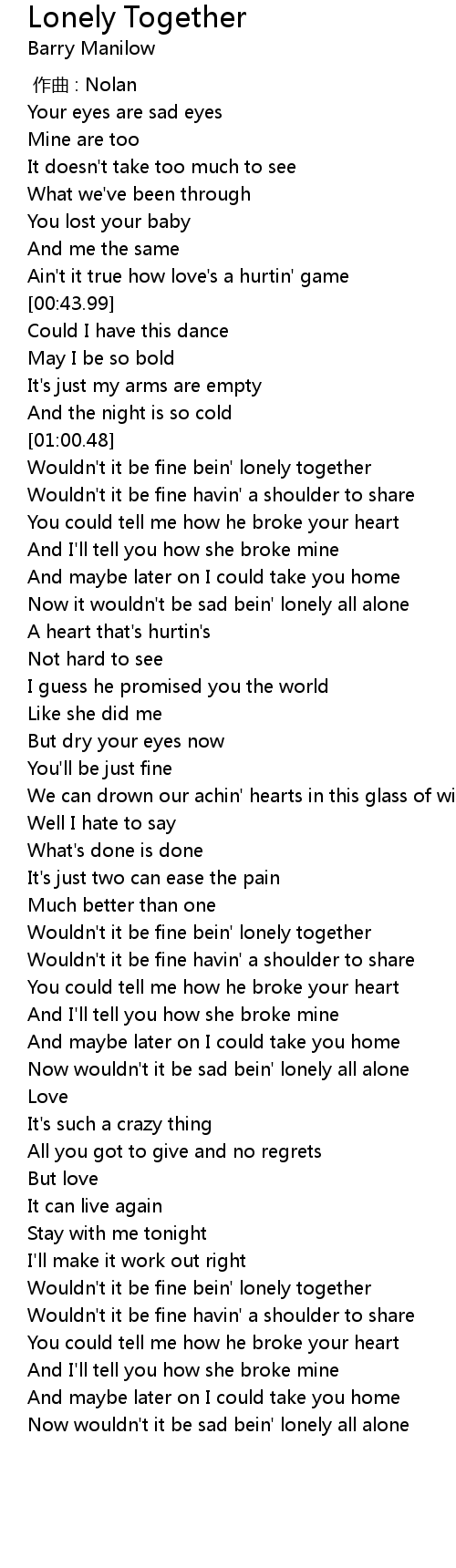 | [02:28.90] | Wouldn' t it be fine bein' lonely together |