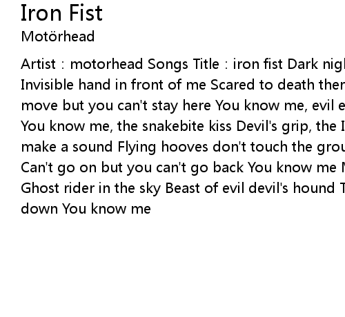 | [00:00.96] | Artist:motorhead Songs Title:iron fist Dark night nothing to see Invisible hand in front of me Scared to death there's someone near Scared to move but you can't stay here You know me, evil eye You know me, prepare to die You know me, the snakebite kiss Devil's grip, the Iron Fist Flying horse don't make a sound Flying hooves don't touch the ground Walk in circle lose you track Can't go on but you can't go back You know me Moon eclipse and you know why Ghost rider in the sky Beast of evil devil's hound Tooth and claw they pull you down You know me |