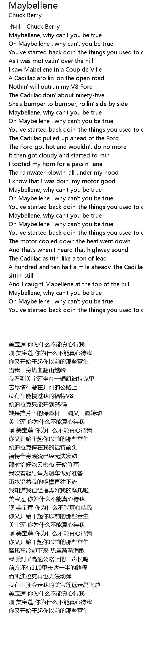 | [00:56.510] | Oh Maybellene , why can' t you be true |