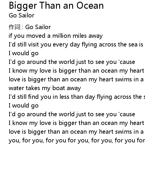 | I know my love is bigger than an ocean my heart swims in a sea of devotion my love is bigger than an ocean my heart swims in a sea of devotion for you for you, for you, for you for you, for you, for you for you |