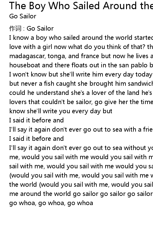 | I' ll say it again don' t ever go out to sea without your pen would you sail with me, would you sail with me would you sail with me around the world would you sail with me, would you sail with me would you sail with me around the world would you sail with me, would you sail with me would you sail with me around the world would you sail with me, would you sail with me would you sail with me around the world go sailor go sailor go sailor go sailor go sailor go sailor go whoa, go whoa, go whoa |
