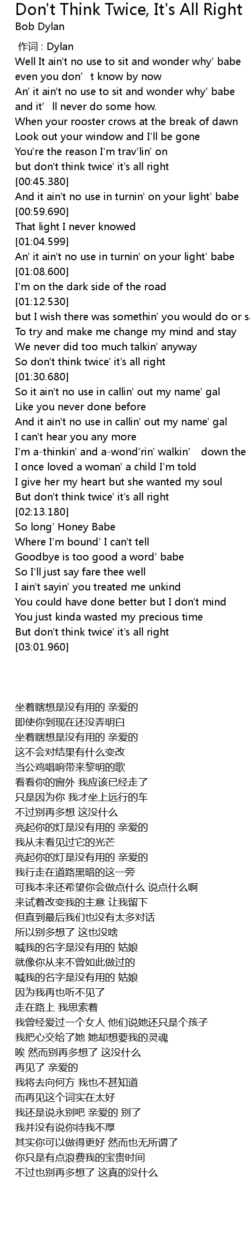 | [00:55.810] | And it ain' t no use in turnin' on your light' babe |