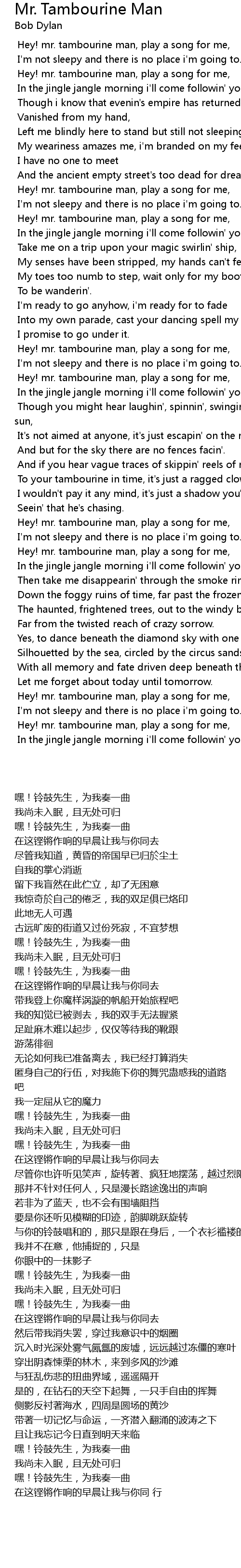 Hey! mr. tambourine man, play a song for me, |