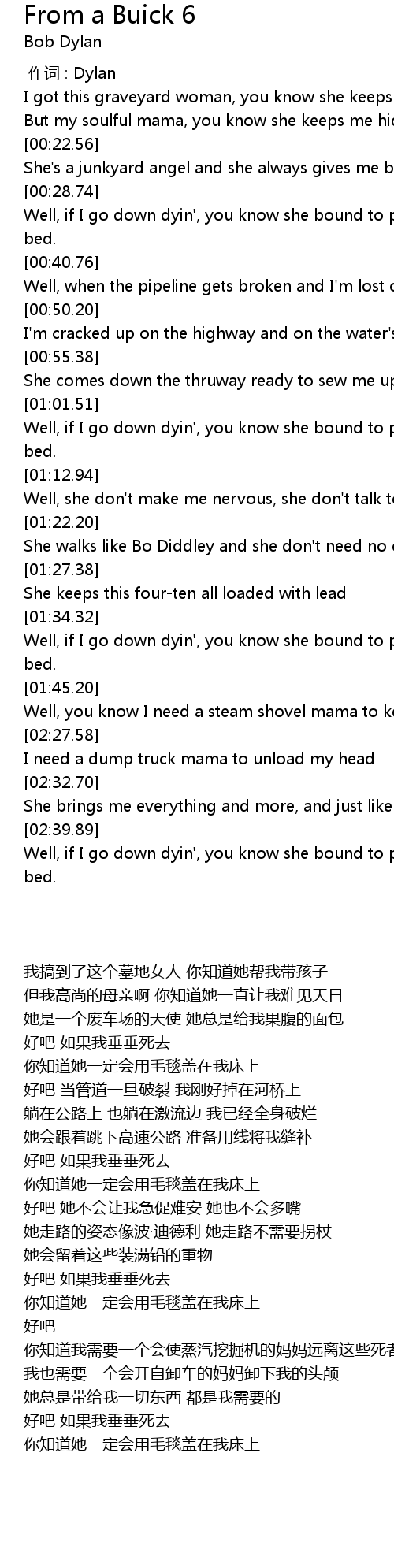| [01:39.01] | Well, if I go down dyin', you know she bound to put a blanket on my bed. |