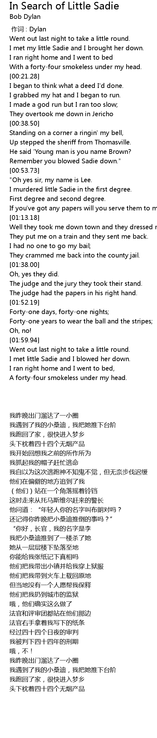 | [00:13.97] | I met my little Sadie and I brought her down. |