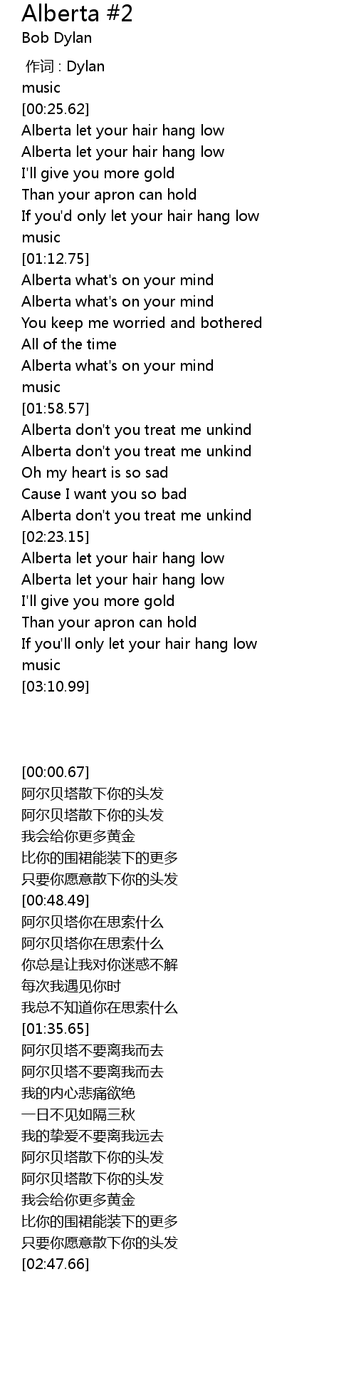 | [02:18.57] | Alberta don't you treat me unkind |