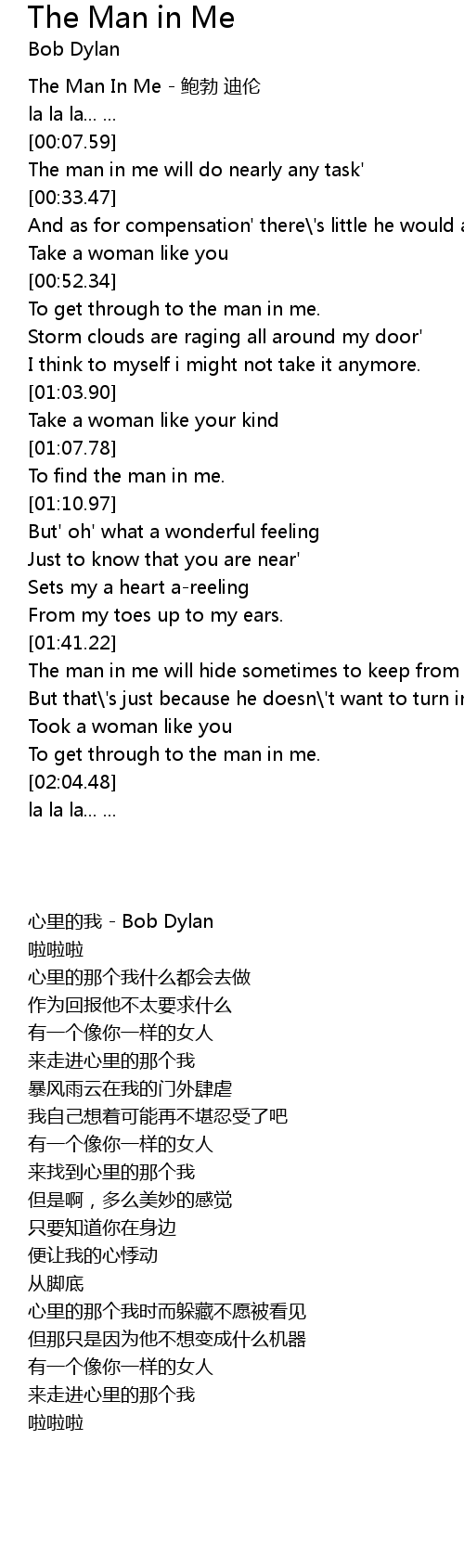| [00:00.90] | The Man In Me - 鲍勃 迪伦 |