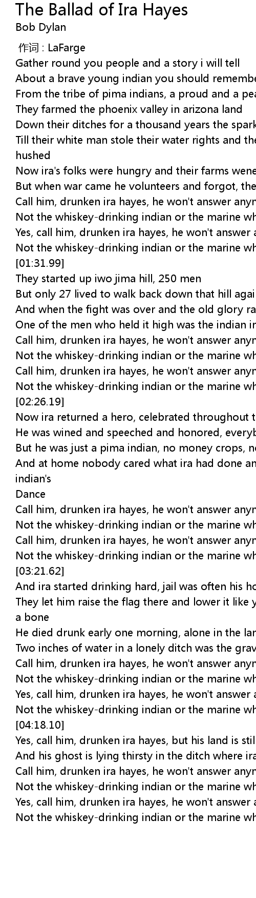 | [01:20.00] | Yes, call him, drunken ira hayes, he won't answer anymore |