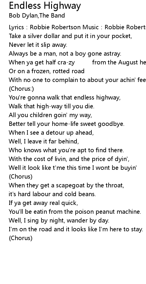 | You' re gonna walk that endless highway, | |