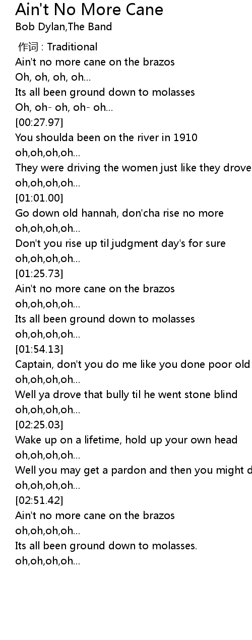 | [00:01.34] | Ain' t no more cane on the brazos |
