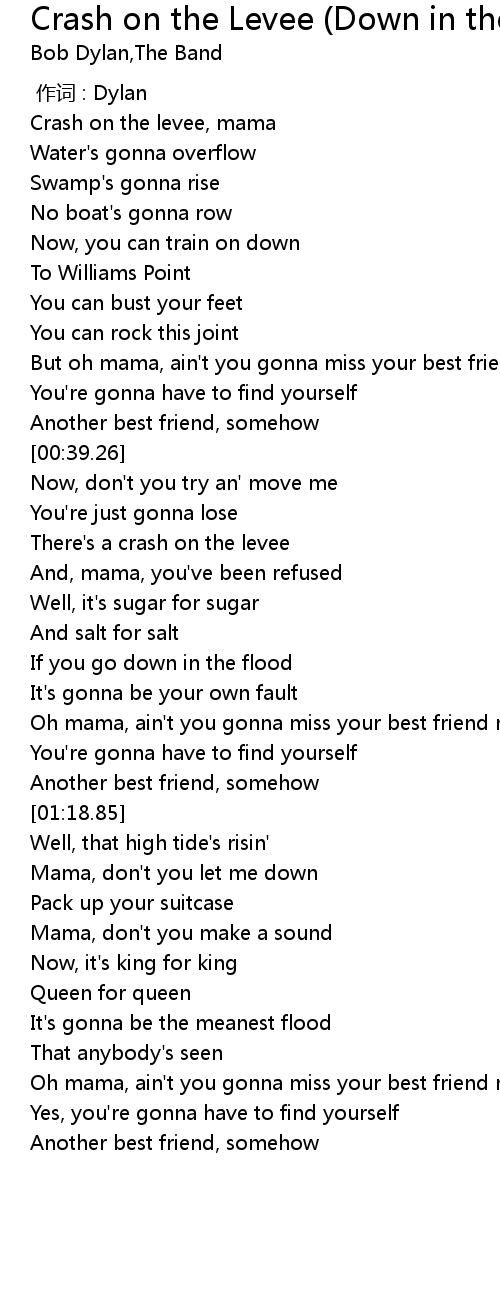 | [00:04.67] | Crash on the levee, mama |