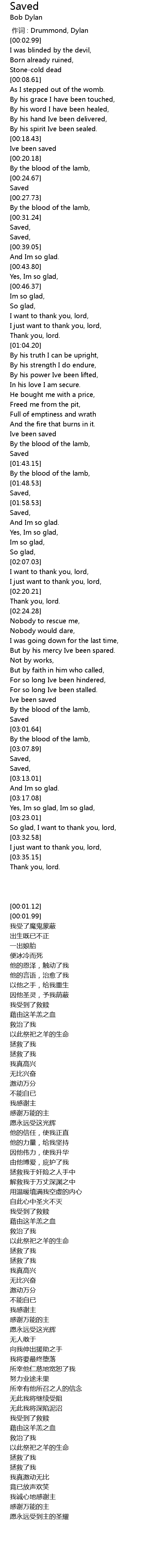 | [00:19.30] | Ive been saved |
