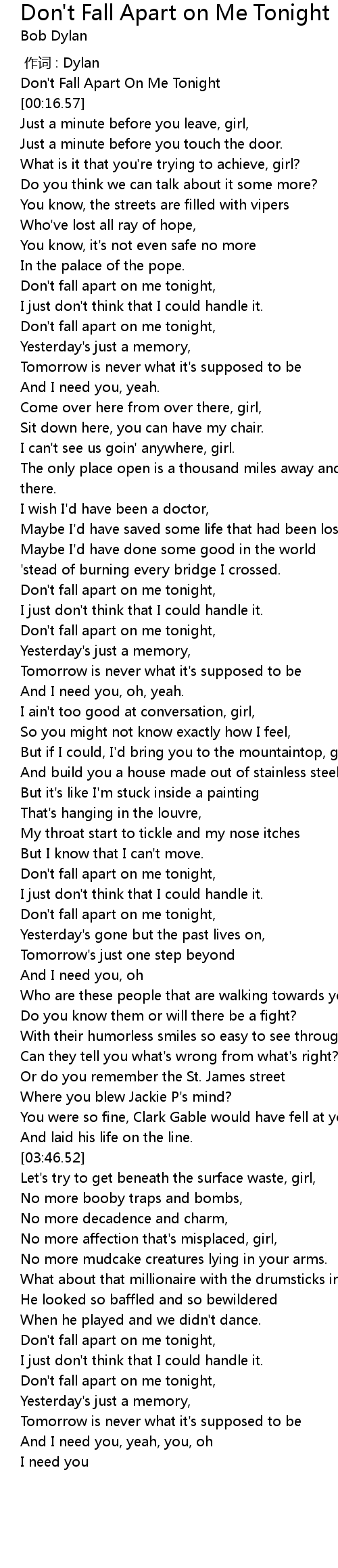 | [00:01.87] | Don't Fall Apart On Me Tonight |