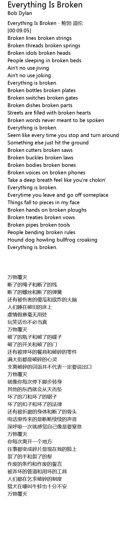 | [00:00.78] | Everything Is Broken - 鲍勃 迪伦 |