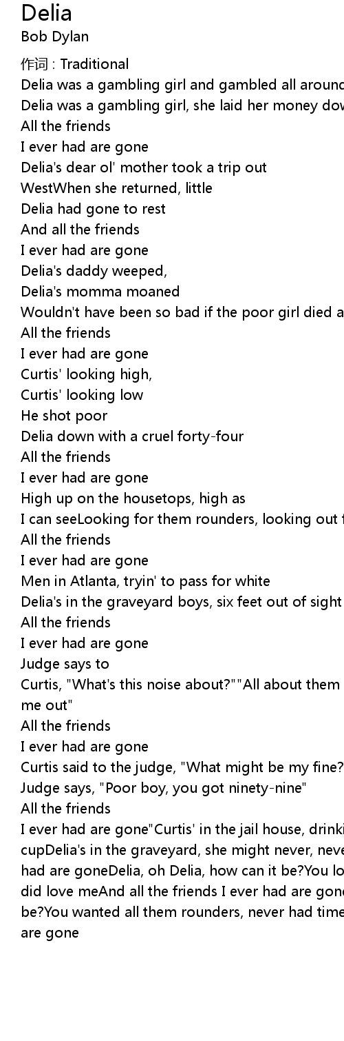 | I ever had are gone" Curtis' in the jail house, drinking from an old tin cupDelia' s in the graveyard, she might never, never get upAll the friends I ever had are goneDelia, oh Delia, how can it be? You loved all them rounders, never did love meAnd all the friends I ever had are goneDelia, oh Delia, how can it be? You wanted all them rounders, never had time for meAll the friends I ever had are gone |