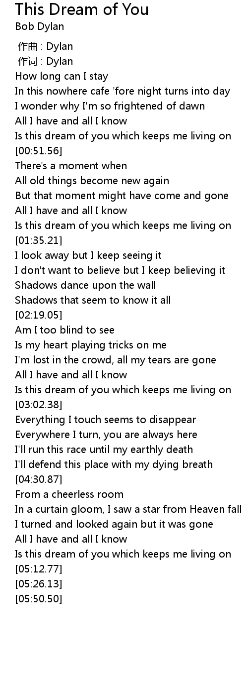 | [05:04.79] | Is this dream of you which keeps me living on |