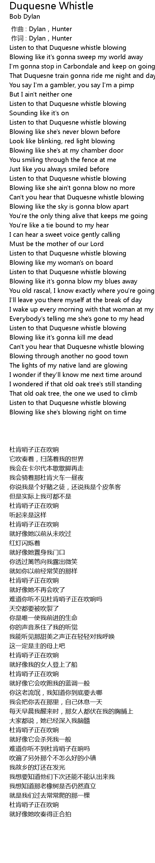 | [02:27.260] | Can't you hear that Duquesne whistle blowing |