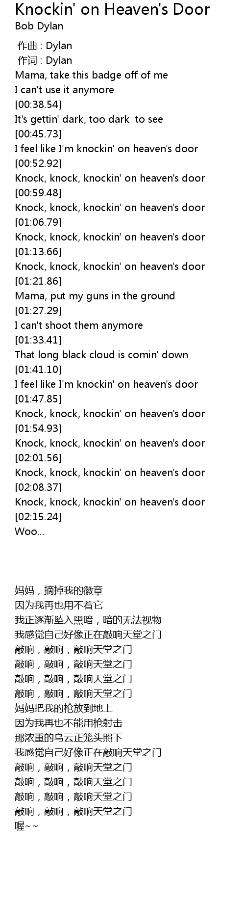 | [01:59.06] | Knock, knock, knockin' on heaven's door |