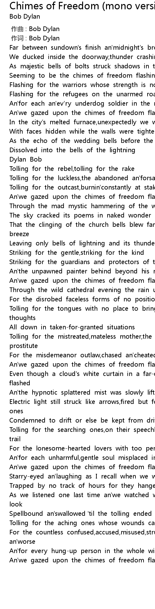 | [00:59.289] | An'we gazed upon the chimes of freedom flashing. |