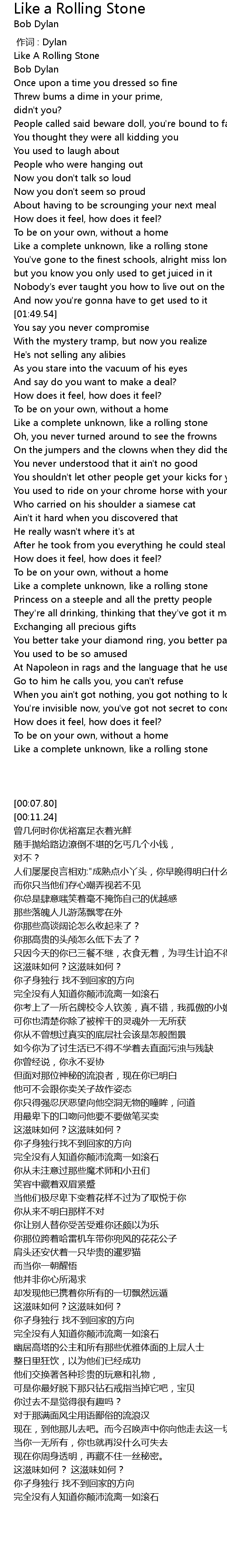 | [01:13.93] | Like a complete unknown, like a rolling stone |