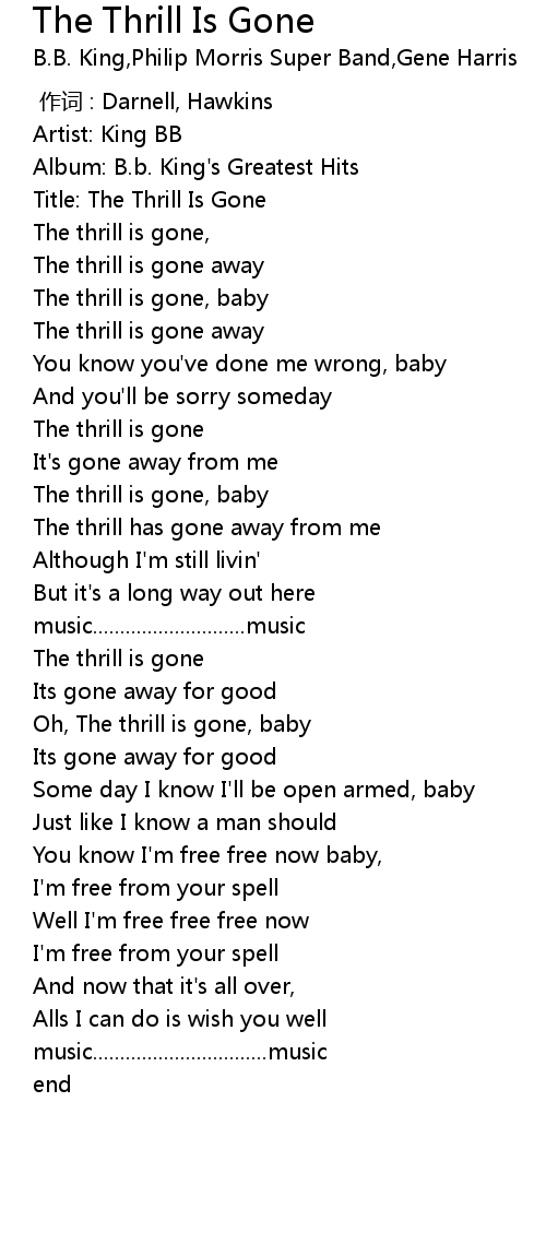 | [02:16.37] | Oh, The thrill is gone, baby |