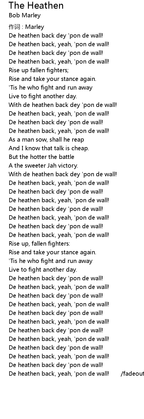 | De heathen back, yeah, 'pon de wall! /fadeout/ |
