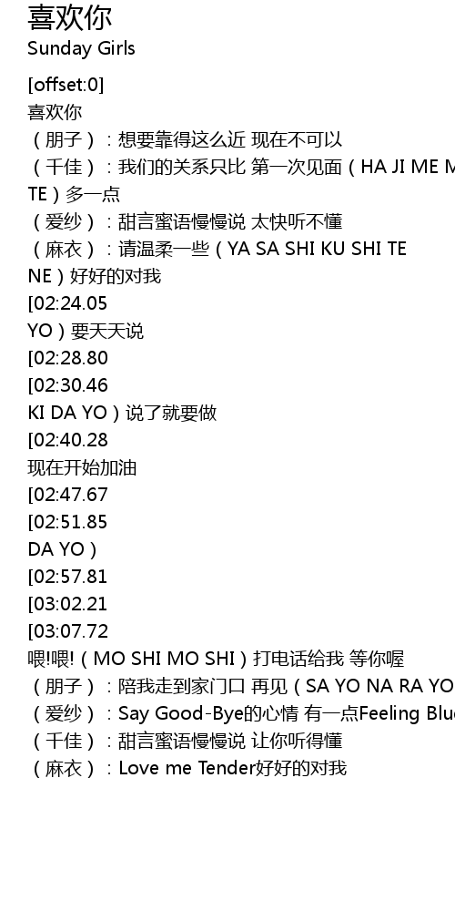 | [03:55.15][02:51.85][01:21.32] | A-AHA-AHA YA YA YA YA A-AHA-AHA喜欢你(SU KI DA YO) |