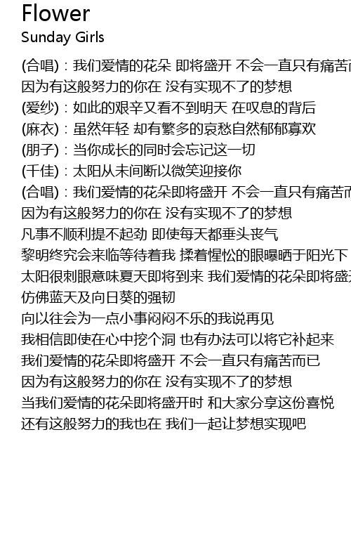 | (合唱):我们爱情的花朵即将盛开 不会一直只有痛苦而已 | |