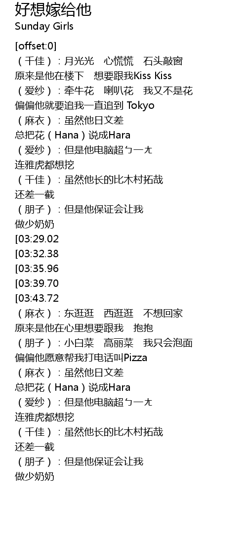 | [03:50.28][03:29.02][02:31.10][01:07.32] | (合唱):阿 想想想 嫁给他 |