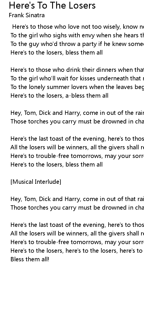 Hey, Tom, Dick and Harry, come in out of that rain |