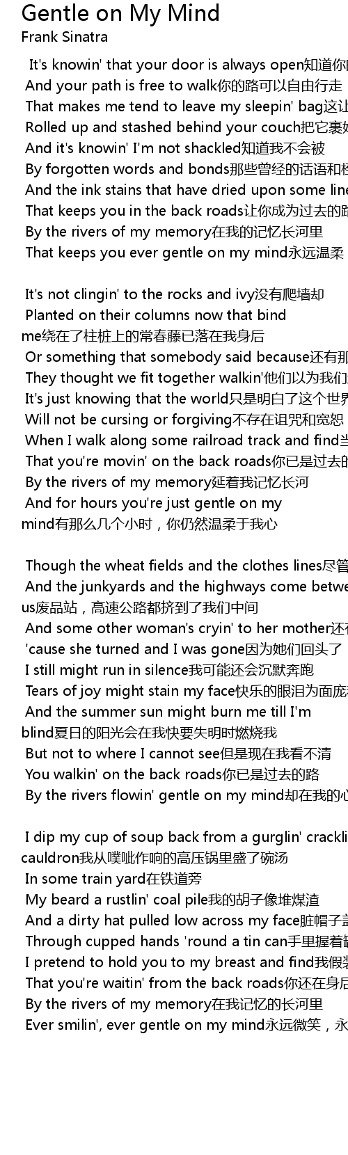 | And for hours you' re just gentle on my mind yǒu nà me jǐ gè xiǎo shí, nǐ réng rán wēn róu yú wǒ xīn | |