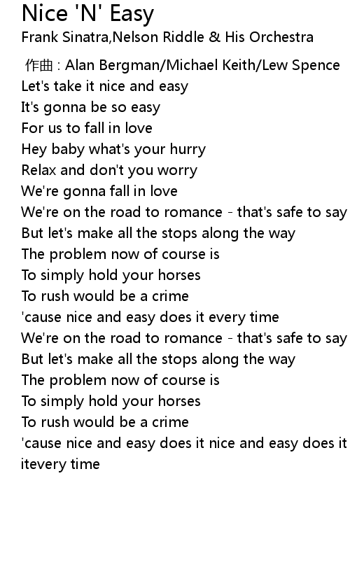 | [02:06.08] | 'cause nice and easy does it nice and easy does it nice and easy does itevery time |