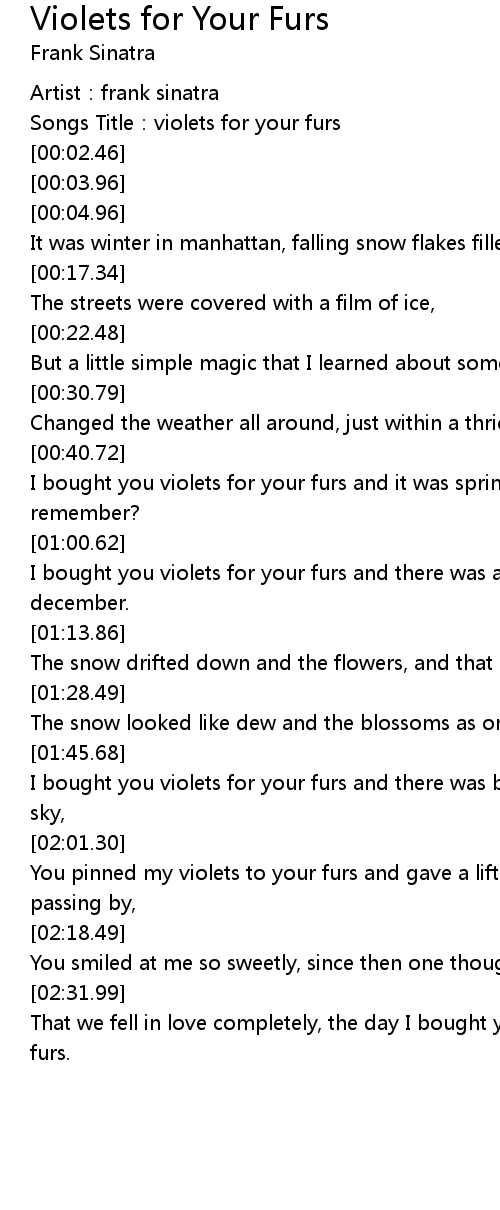 | [00:45.05] | I bought you violets for your furs and it was spring for a while, remember? |