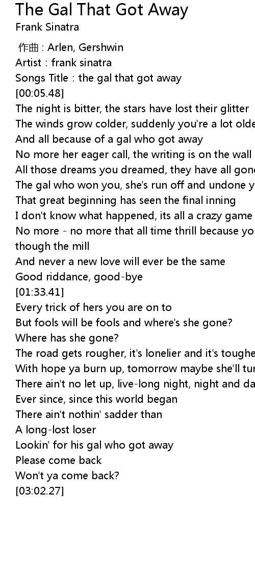| [00:02.62] | Songs Title:the gal that got away |