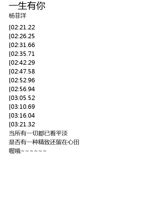 | [01:40.50][03:21.32][04:09.15][04:30.39][04:35.86] | 可知一生有你我都陪在你身边 |