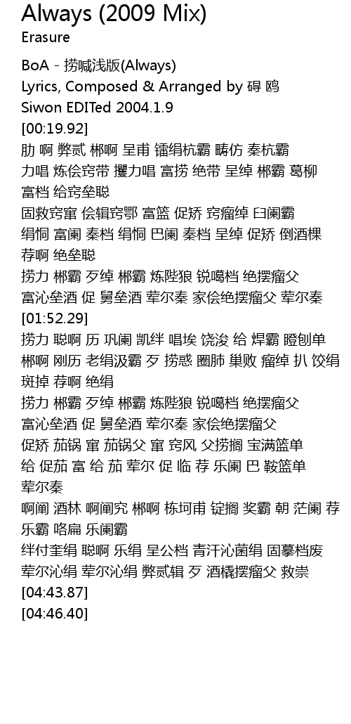 | [00:00.88] | BoA - 捞喊浅版(Always) |