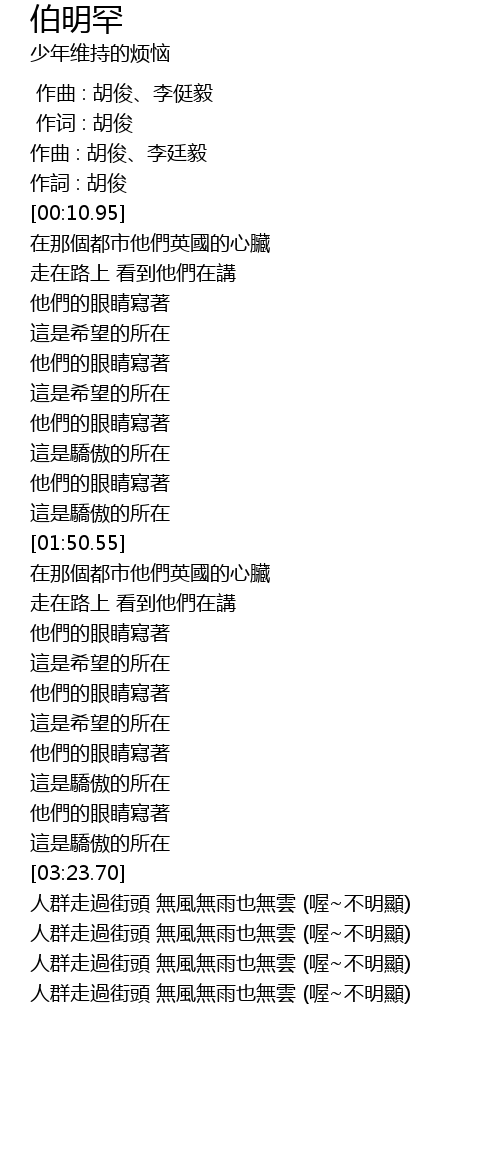 | [00:00.00] | 作曲 : 胡俊、李侹毅 |