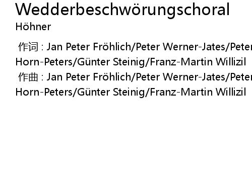| [00:00.000] | zuo ci : Jan Peter Fr hlich Peter WernerJates Peter HornPeters Gü nter Steinig FranzMartin Willizil |