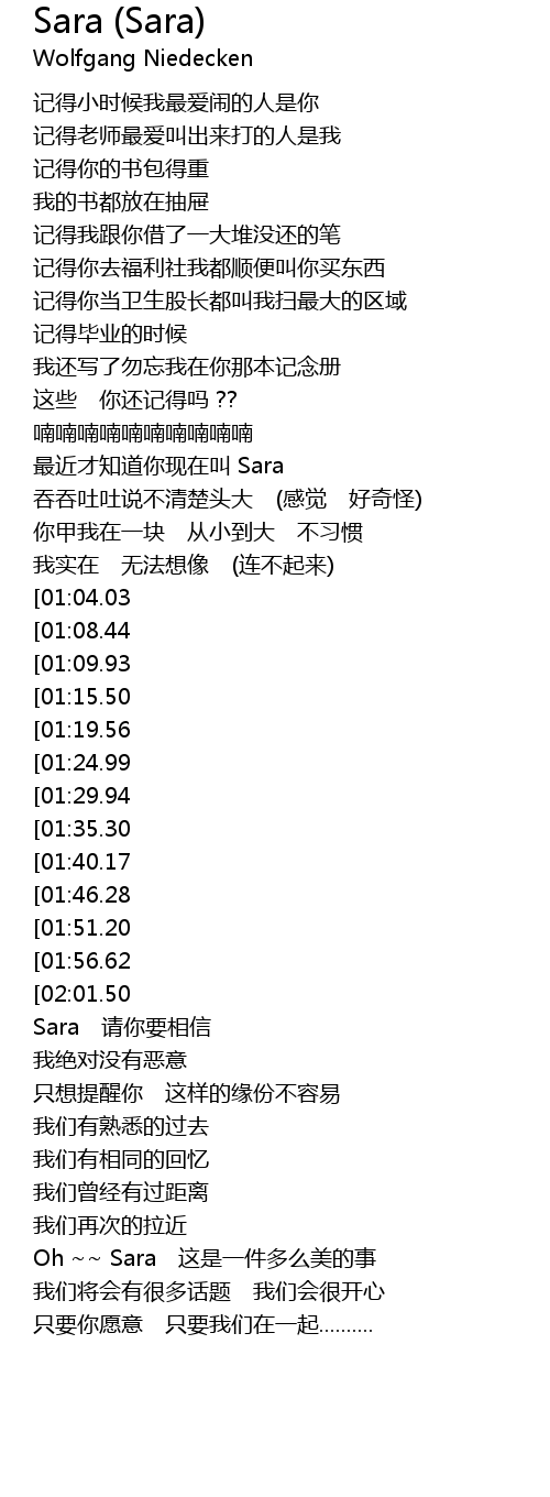 | [03:00.87][01:56.62] | Oh Sara ni rang wo xin jing jing |