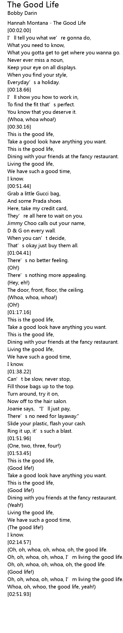 | [02:39.19] | Whoa, oh, whoo, the good life, yeah! |