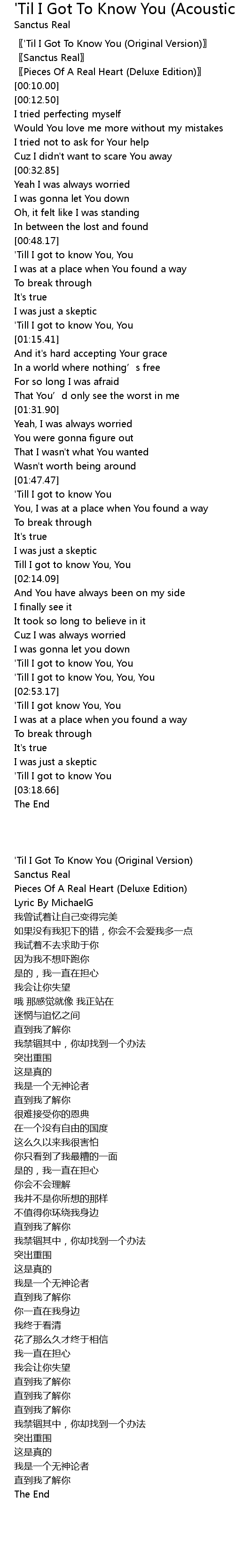 | [00:02.50] | ' Til I Got To Know You Original Version |