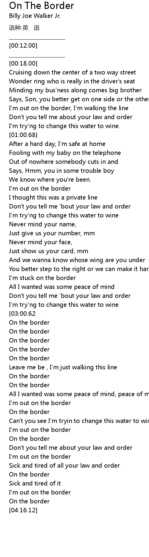 | [00:40.77] | I'm out on the border, I'm walking the line |