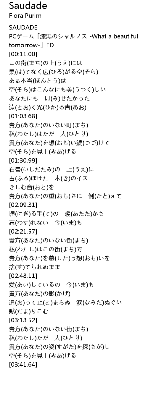 | [00:08.00] | PCゲーム「漆黒のシャルノス -What a beautiful tomorrow-」ED |