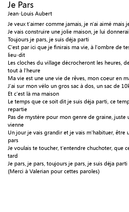 | Je veux t' aimer comme jamais, je n' ai aime mais je pars | |