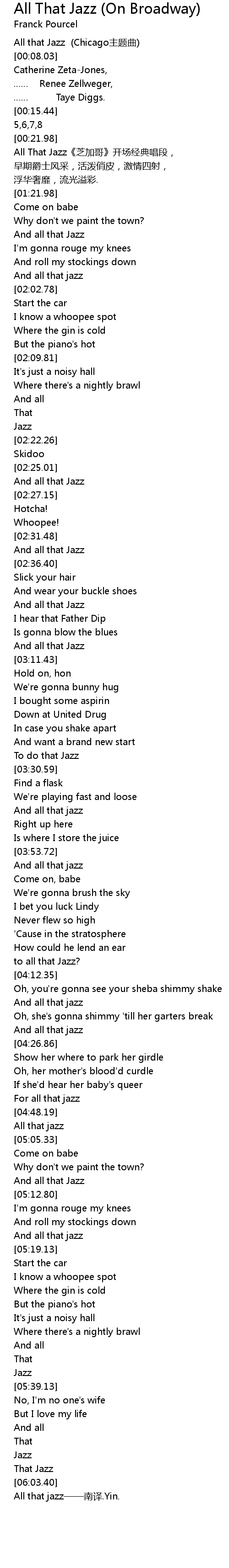 | [00:30.98] | All That Jazz zhi jia ge kai chang jing dian chang duan, |
